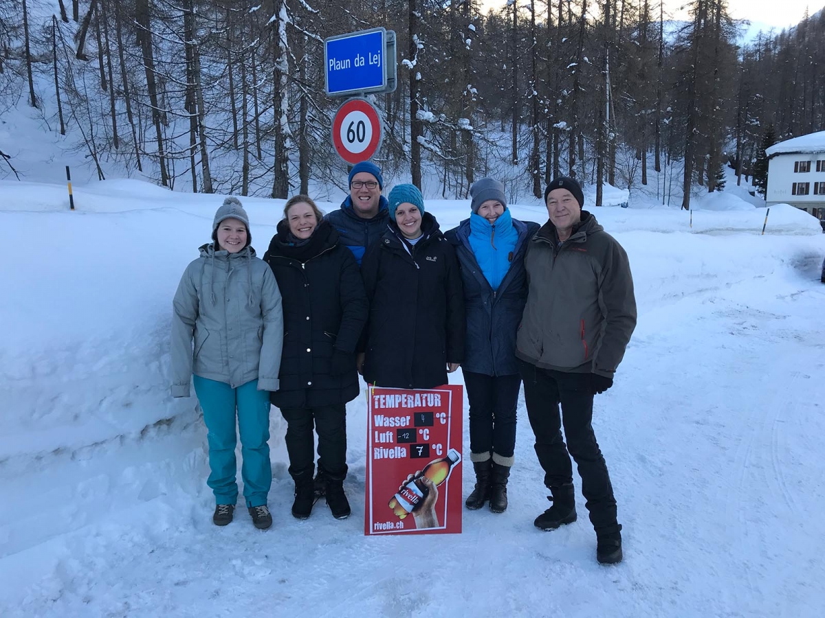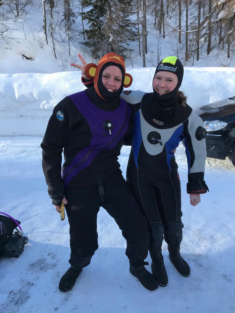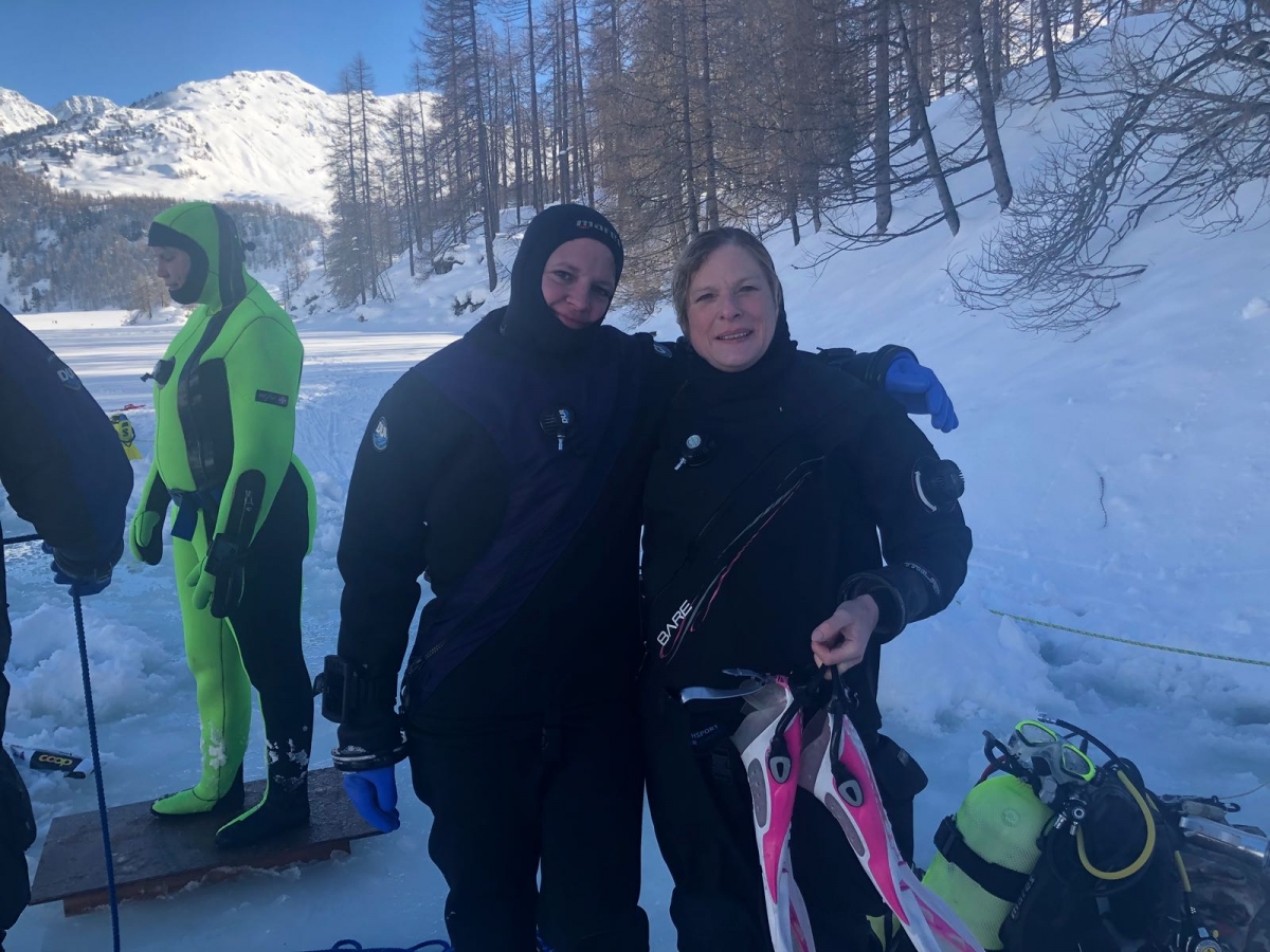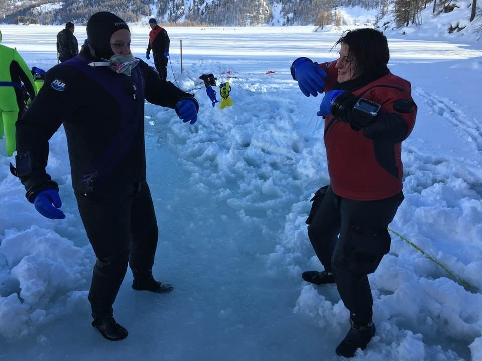 Nach einem reichlichen Frühstück am Samstag ging es nach Plaun da Lej zum Parkplatz Alp Murtaröl. Das Schweizer Fernsehen war bereits mit einem kleinen Team an einem Eis-Loch und drehte für eine DOK-Serie eine Filmsequenz mit anderen Eistauchern. Gegen halb 11 durften wir ebenfalls hinein ins Abenteuer. Für viele war es der erste Sprung ins Eiswasser. Für viele auch ein Sprung ins Unbekannte. Wie werde ich unter dem Wasser auf das Eis reagieren? Werde ich mich wohl fühlen? Sitzen die Unterwassersignale, die man über das Sicherheitsseil nach oben leitet? Das Team von TSK tat hier eine wunderbar ruhige Arbeit und Urs Grigoli, langjähriger Ausbildner der Seepolizei Graubünden, konnte mit seiner erfahrenen Art vielen die Aufregung nehmen. Und dann ging’s endlich durch die Schnee- und Eisschicht hinab in den schnapsklaren See, indem mein Buddy Marianne und ich durch Karabiner am Sicherheitsseil befestig waren und so mit unserem Seilführer Malcom an der Oberfläche verbunden blieben. Unter Wasser war die Nervosität wie weggeflogen, die Neugier, das Wasser unter dem Eis zu erkunden, wuchs mit jeder Minute. Der Blick nach oben an die Decke war einfach wundervoll. Das Einstiegsloch wurde von unten gesehen zum riesigen Oberlicht, die Lichtstrahlen flackerten wie in einer Säule vereinzelt hinein. Rund ums Loch war alles dunkel – das heisst, fast: Wenn nicht viel Schnee auf dem Eis lag, schimmerte etwas Sonne fein durchs Eis, wie Sterne hinter Wolken. Oben an der Eisplatte entdeckten wir viele Luftblasen, die sich an der Unterseite versammelt hatten und wie umgekehrte Pfützen an der Eisdecke klebten. Ich hätte stundenlang dort unten bleiben können. Zurück an der Luft wechselten wir uns ab mit der Leinenführung, jeder durfte einmal, während unter der Eisplatte Kopfstände geübt wurden. Abends im Restaurant widmeten wir uns nach dem Tag an der frischen Luft dann wieder der Wärmezufuhr. Crema Catalan und Apfelstrudel lassen grüssen.