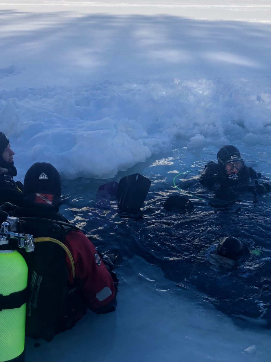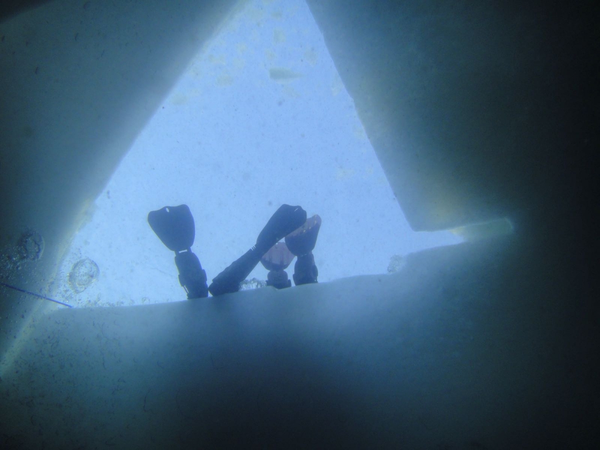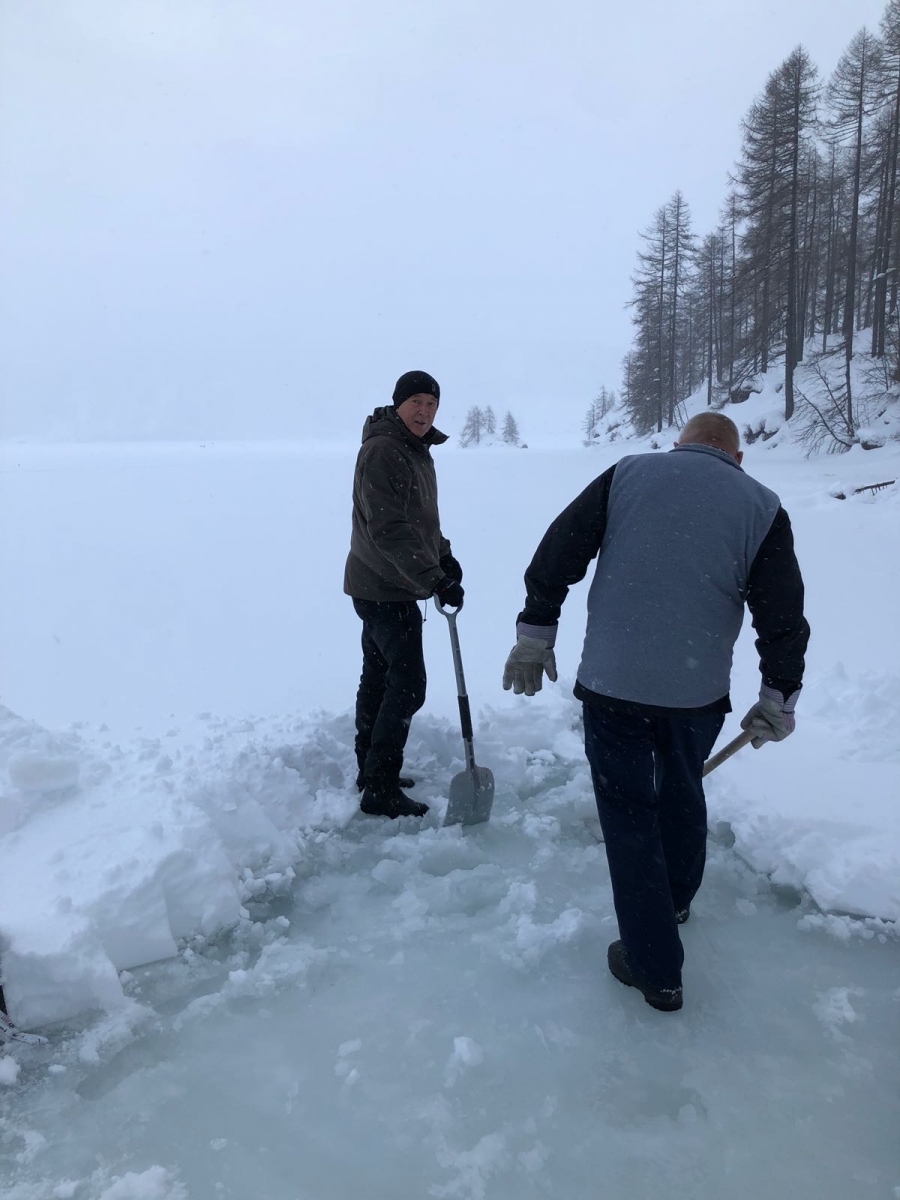 Am nächsten Morgen zurück bei den beiden Eislöchern, hiess es erst einmal wieder Eis aufpickeln. Wie ein dreieckiges Fenster im Schneeboden hatte die Kälte über Nacht den See mit einer rund vier Zentimeter dicken Eisschicht wieder zugeschlossen. So wurden erneut Seile verlegt, Palstecke geknotet und Karabiner eingeklinkt. Es konnte losgehen. Noch ein letztes Mal. Das Wasser war zwar etwas trüber als am Vortag, die Tauchgänge aber nicht minder eindrücklich. Es bleiben nicht nur viele neue Begegnungen mit lieb gewonnenen Leuten, sondern auch einmal mehr die Erkenntnis, wer über seinen Schatten springt und sich von Zeit zu Zeit selber ins kalte Wassers schubst, wird reich belohnt. Danke für alles!